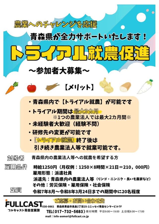 青森県内の農業法人等で、常時雇用者の雇用を希望している法人等(個人農家も可)