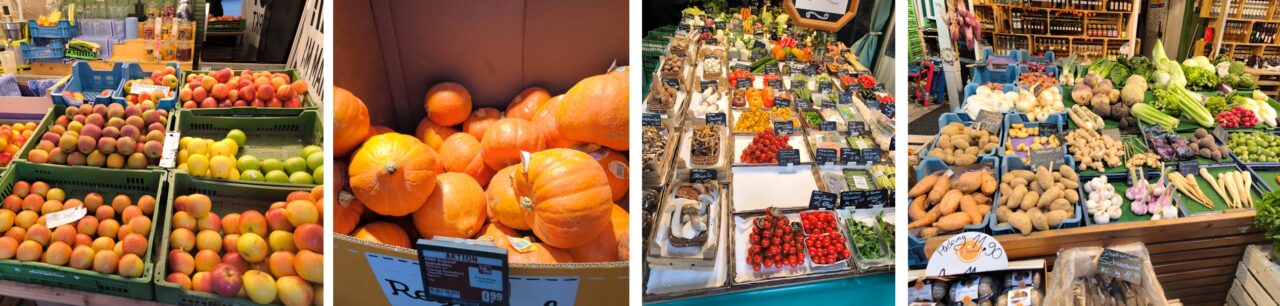 - 野菜は、ミニトマトが7個で約540円、ジャガイモが1個約100円。そのほかにも、にんにく、ごぼう、キュウリ等、様々な野菜が販売されていた。かぼちゃは北海道産が販売されていて、通訳者によると、ミュンヘン周辺で販売されているかぼちゃは、ほぼ北海道産とのこと。ドイツではハロウィンで使用する装飾向けのかぼちゃの栽培が盛んであるため、食味が良い北海道産のかぼちゃが広まったよう。価格は1個270円ほどだった。