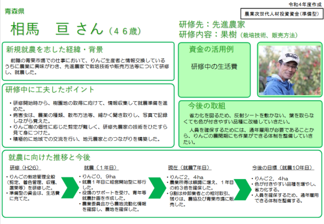 本県からは、研修を受けて就農した方(果樹)と、初期投資を行った方(施設野菜)の事例が紹介されています。