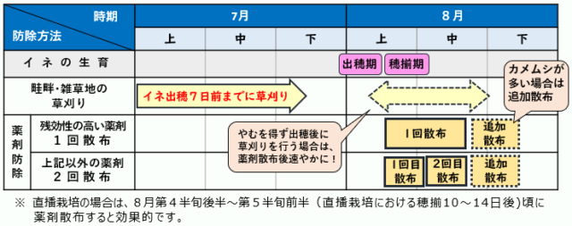- 穂揃期以降に2回散布、もしくは残効性の高い薬剤を1回散布しましょう。
