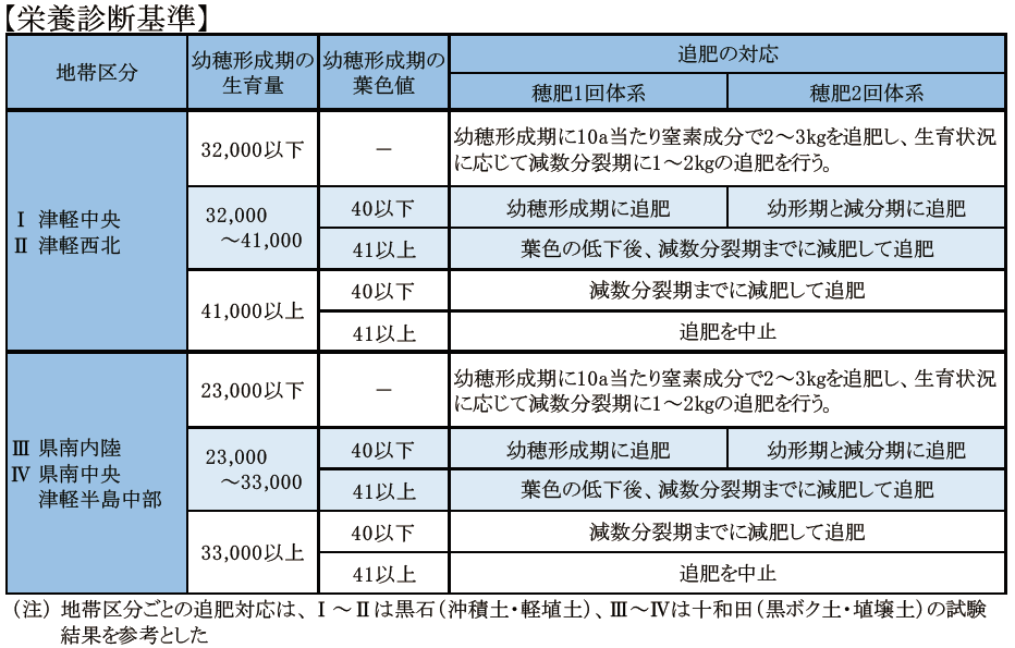 追肥は幼穂形成期を確認し、生育量(草丈×㎡当たり茎数)と葉色値(SPAD-502)から総合的に判断し、栄養診断基準(表)に基づき行ってください。