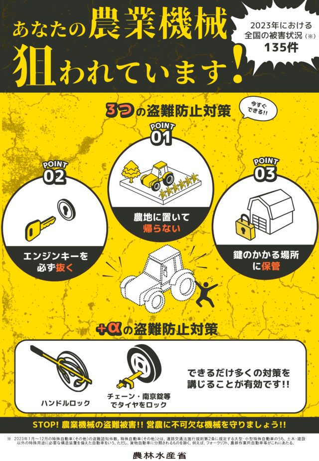 特に3~4月の春先に盗難が増加する傾向にあるため、盗難防止対策を徹底し、営農に必要な機械を守りましょう!