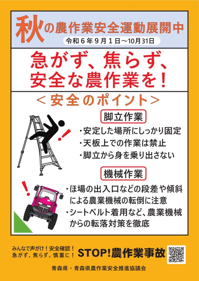 県では、秋の収穫作業を迎えるに当たり、農業機械等による事故を防止するため、「秋の農作業安全運動」を展開しています。
